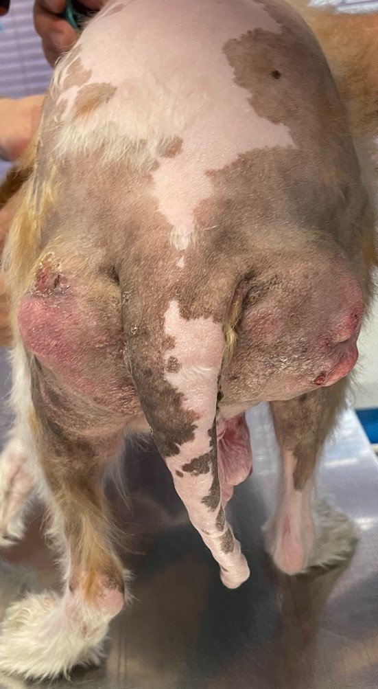 Spre exemplu, în cazul dermatiei alergice la purici, tratamentul cu glucocorticoizi se adresează pruritului și nu cauzei primare. Astfel, acesta se va iniția pe o perioadă scurtă de timp. În acest caz, probabilitatea apariției efectelor secundare va fi minimă. Pe de altă parte, o atenție deosebită trebuie acordată bolilor dermatologice care necesită monitorizare pe termen lung, de exemplu pemfigus foliaceu.
